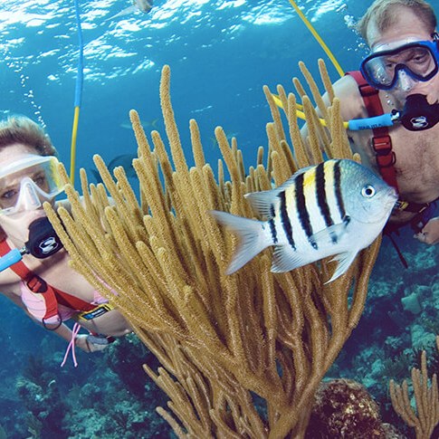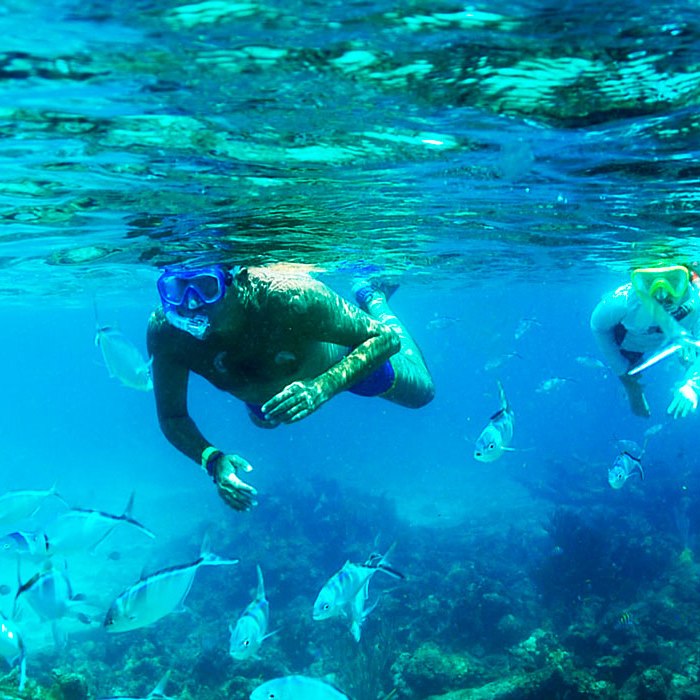 Existe buceo en apnea, eso es lo que se denomina snorkeling, es una palabra anglosajón. Se hace usando una máscara con un tubo al lado izquierdo generalmente, y siguiendo con las aletas que permiten el movimiento de los pies de forma más ágil tanto en la superficie que debajo del agua.